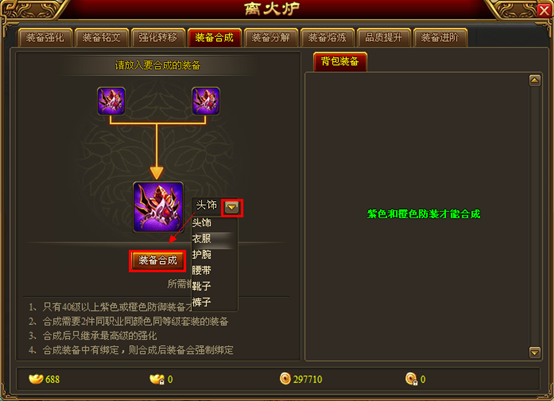 1、 只有40级以上紫色或橙色防御装备才能进行合成;